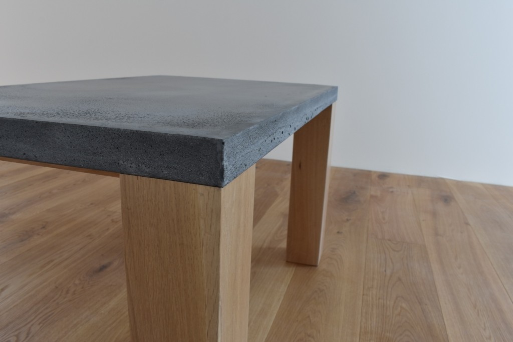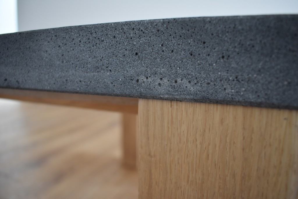 Konferenční stolek s dřevěnýma nohama z dubového masivu. Dřevo může mít strukturu hladkou nebo kartáčovanou. Betonová deska může mít sílu od 1,5 cm. (na obrázku síla desky 4 cm) Váš výběr napište do poznámky. Rozměr betonové desky: 550x850x40 mm