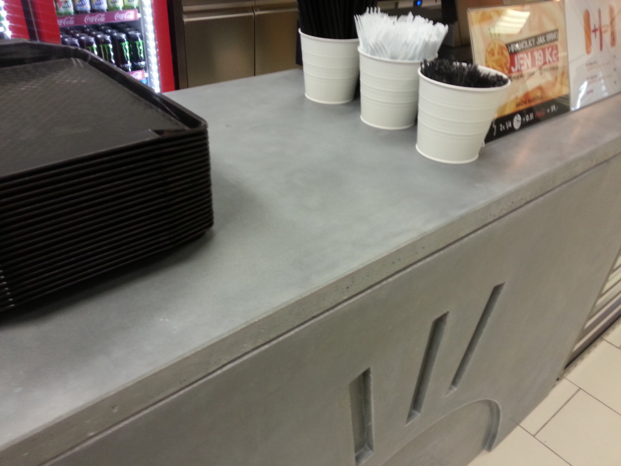 Pro restauraci rychlého občerstvení v Brně jsme vyrobili betonové pulty a jejich obložení.