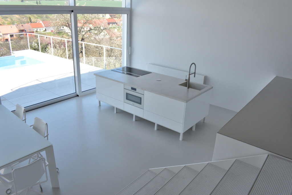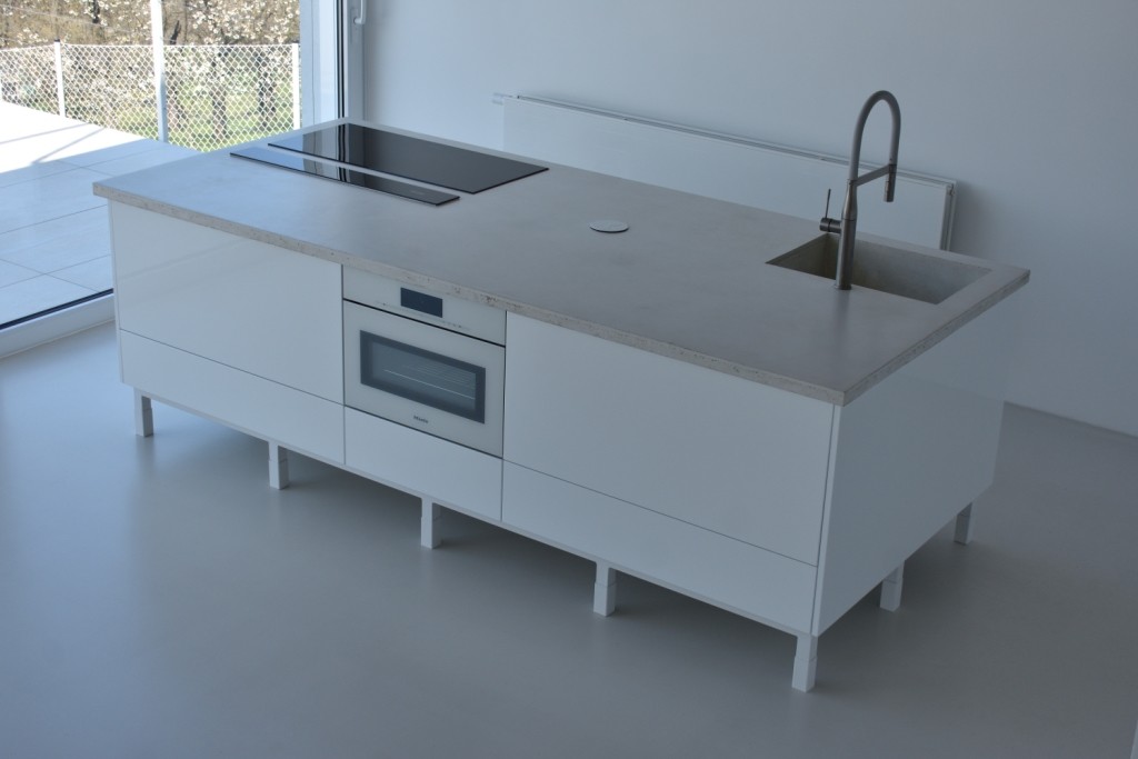 Vyrobili a instalovali jsme zákazníkovi betonovou kuchyňskou desku včetně integrovaného betonového dřezu, výřezy na digestoř, varnou desku a výsuvný elektrický modul.